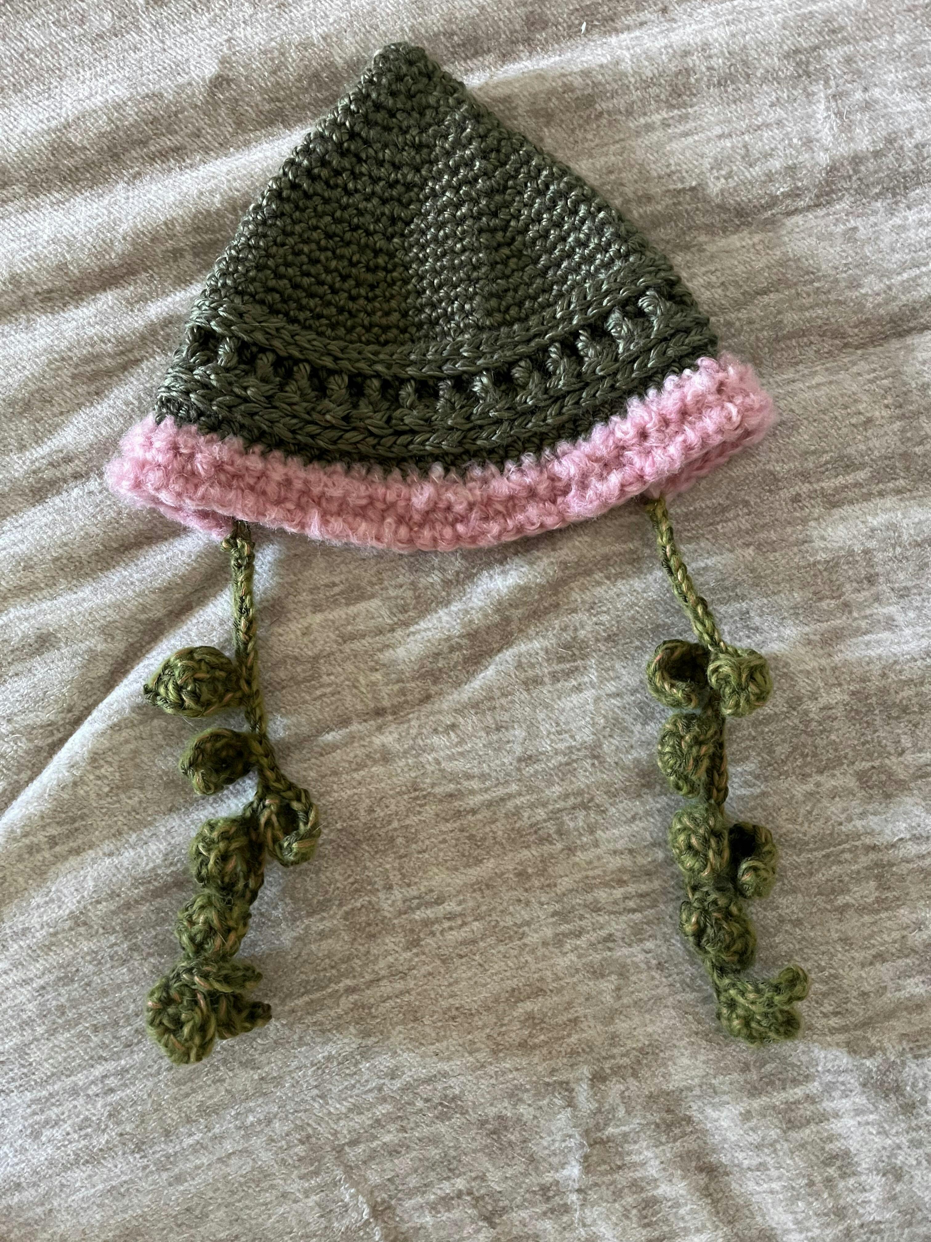 Materials: Red Heart Hygge (or equivalent yarn) for body of the hat, Lion Brand Go for Faux (or equivalent yarn) for brim of the hat, Red Heart Soft (or equivalent yarn) for vine tassels, 5.5mm Crochet Hook, 6.0mm crochet hook, Tapestry Needle, Scissors, 2 Stitch Markers